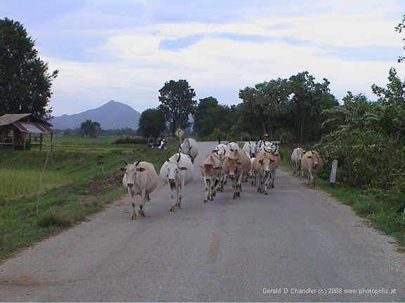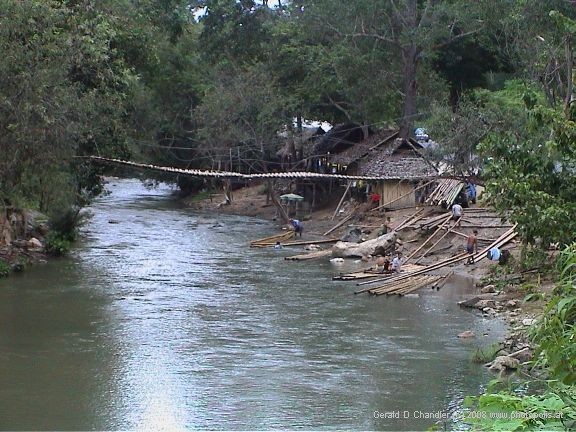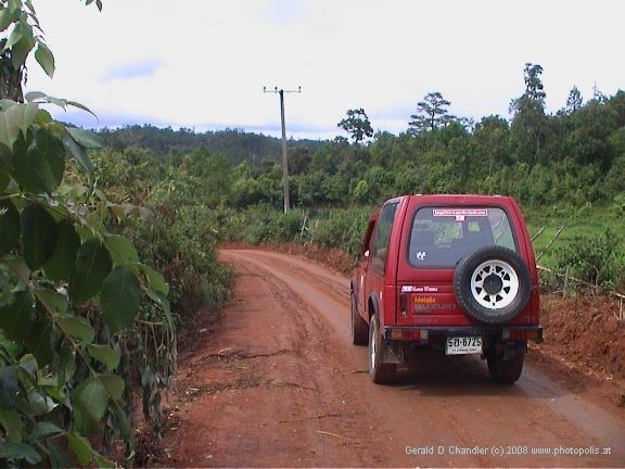 In Chiang Mai we twice rented a car. And twice we got very lost. The first time it was just to see how far we could go and the second time because in spite of getting lost the first time we enjoyed the freedom of being able to drive and Gerry wanted to get to the top of the mountain. This is the little Suzuki Carribian that we rented. It was a bit like a tin can but it was very reasonably priced and did get us both there and back without any real mechanical problems. Advertized as a 4-wheel drive runabout, we found it just too underpowered to take us over any rough terrain. This wonderful old Lanna-style wooden temple in Lampang was one of our main goals for our first day's outing. It was unusual by comparison to other Chiang Mai temples we knew in that it is made entirely of wood that is stained rather than painted and its architecture is open-sided giving it an wonderfully airy feel. When we were there it was beseiged by a large group of Thai schoolchildren, who found us about as amusing and interesting as we did them. There was also a small garden in back and two or three smaller temples in back of the main building. This was one temple definitely worth a detour. This is an example of the glorious scenery we found during our excursion. We really wanted to be in the mountains you can see there and had hoped to get close to the top of Doi Inthanon, the highest peak around. Alas, our maps were inaccurate and we didn't have our Lonely Planet with us and so although we had great fun, we never really made it to the National Park of which Doi Inthanon is the core. We never got tired of this kind of southeast Asian landscape with its water-filled rice paddies, lush green vegetation, and imposing high mountain backdrop. We saw more of it in Vietnam and Loas than Thailand, but we have to say that Thailand is no slouch when it comes to scenery. Here is another taste of rural life in the Chiang Mai countryside. For all the sophistication of the large cities like Bangkok, the countryside is still quite primitive with lots of work done by hand rather than machine. But as you can see the road here is paved and with paved roads come the inevitable motor bikes and cars that testify to increasing wealth. What the rural landscape did not have was signage. And what signs it did have were incomprehensible to us being in the Thai alphabet and impossible for us to find on our very inadequate map. But we mostly enjoyed getting lost in small farming villages and on country roads. Wouldn't you in this kind of environment? Here we are off the beaten track, still trying to get to Doi Inthanon for the second time. When we did finally find a track that went in the right direction, it quickly became so steep and it was so muddy and slippery that even in our supposedly 4-wheel drive vehicle, we declined to attempt it. As we were driving back to town, the road took us along this river which is where many tour groups go rafting and for elephant rides. We saw a group disembarking and vaguely wondered if we should do such a thing. |