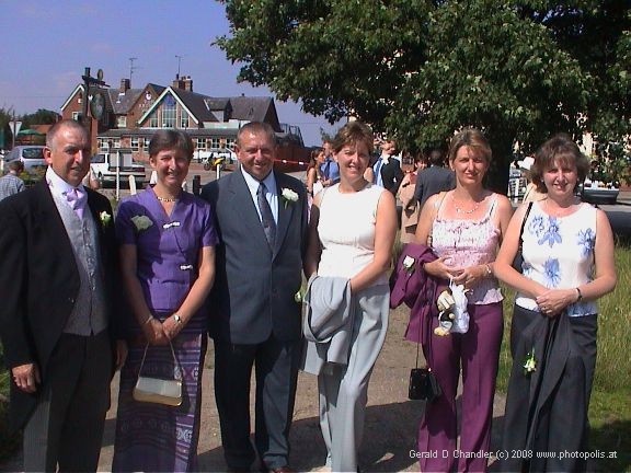 Chris and Sam's wedding was a first for our family, in that the wedding was to be held not in Darlington but in Bingham, near Nottingham, where the happy couple own a house. That meant that the six brothers and sisters (that's us to the right; put the cursor over the person to get their name), six spouses (click to get the spouse), seven children, one spouse, two boyfriends, two grandchildren, and their great grandmother all had to be accommodated somewhere in or near Bingham. Luckily, Chris and Sam had started planning well in advance of the date — we got our invitations while we were in China back in the fall of 2000. They found a lovely hotel overlooking the river Trent in Gunthorpe that was big enough to take our whole party for the Friday and Saturday nights. The weekend weather was unbelievably lovely after a very wet and dismal early summer. The Bingham village church was as picturesque as only an English village church can be. The bride looked very lovely, the groom as handsome as any film star (or should I say, football player?), and a very good time was had by all. We celebrated the wedding in a private garden in bright sunshine and then danced the night away in an adjoining disco. The latest trend in Britain seems to be foreign weddings. Couples now jet off to Florida or Greece to tie the knot. The Bates family hasn't got there yet, but who knows, maybe next time. After all there are another six in Chris and Sam's generation still to be married... A new experience for us were the preliminaries to a wedding. The happy couple prepare for the event like many other couples by organizing a stag party for him and his friends and a hen party for her and her friends. Such parties are not of recent origin, but the type of party is. Jan got to participate in a hen party for Kath Meadows. Kath married Mike Hendy at the end of August. Then there was the wedding of Jan's college friend Dinah & Mick late in life after many happy years together. The wedding proper we missed but they scheduled a big party to celebrate not only the wedding but also Mick's 60th birthday and their joint retirement. The party was held at the end of summer in Hempstead town hall and we went to London for that. Finally, we left Britain to go to the USA to attend the wedding of Moshe, our long time friend of Israeli origin, Belgian education, and American citizenship, to Cristhiane Luce Vieira, his new Brazilian love. |