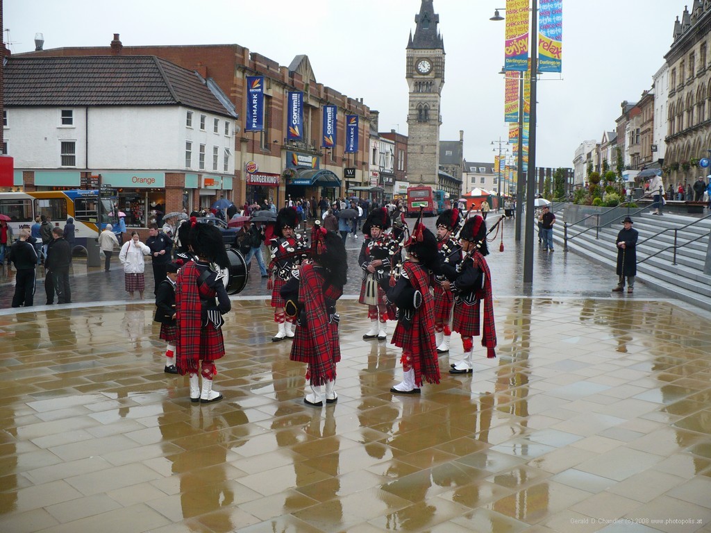 On the day of Jan's birthday we went into town late, wanting to find a place to have a nice meal to celebrate. To our surprise the fine restaurants and the pubs were all closed at the hour we wanted to eat. We were kindly directed to the Dolphin Center cafe. That was in the end quite acceptable, although a long way from first choice, because it gave us a bird's eye view of the market square in torrential rain. We were happy to be warm and dry. A side benefit was that we saw the much expanded and re-organized Center. Its main element, the swimming pool seemed the same as ever. But the main entry way had been redone and it flashed. The center had expanded to the adjoining building and a large cafe there replaced the older, more down market one we were used to. One of our early "chores" was to get a cellphone, or preferably cell-phone service. Days before we left Australia Gerry had bought a nice Sony-Ericsson W300i and with a new SIM we'd had service all through South Africa. We'd skipped getting service in Paris because it cost as much to get a SIM card as to buy another phone. The idiocy of the pricing made us do without as we really didn't need it. But in Darlington we had a lot of family that it would be nice to reach wherever we were. After looking around a bit it became clear that the obvious answer as to what to do was also the right choice: Get it wholesale from the member of the family in the business. Well, that's not exactly right. Michaela, our neice, worked for O2 [sic! That is what they call themselves] and as they had a pretty good deal going, Gerry got a SIM card, getting, as you would expect, great service from her. (A SIM for Jan's South African phone was out of the question because it was locked to a South African network and we couldn't find anyone willing or able to unlock it.)