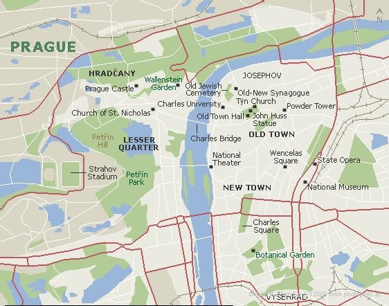 The north side of Josephov is defined by the Vltava River; the area east of Josephov, south of the Vltava, and