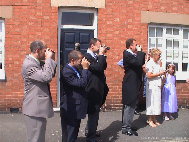 Jan Bates, Gerry Chandler, Bingham Church, July 27, 2002 We're at the wedding of our nephew, Chris Bates to Samantha Walker. The wedding was held in a 13th-century church (much altered) in Bingham, England, a mile from where they live. Bingham was a small village and is now a commuter suburb of Nottingham, about 10 km west. Not too far north are the remnants of Sherwood forest (of Robin Hood fame.) Jan's suit was made in Thailand from a length of hand-loomed silk we bought in a mountain village in Laos. We bought it from a lady who had her loom in the back room. The excellent job of dress making was done near Ban Sang, northern Thailand, a month later. The person on the right really is the husband of the person on the left. Gerry, as you know, rarely wears a suit, perhaps five or six times in as many years. On an impulse he bought this one while we were in Hoi An, Vietnam. Like Hong Kong of many years ago there are dozens of shops that specialize in making something overnight for the tourist to carry away. In the center of town they charged $25 for a suit; away from the center, where this one was bought, the price was $20. Up close, it looks like a $20 suit.