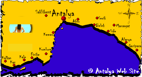 First Day at Ani PensionBack to the beginning. While in Israel we looked in the newspapers for last minute travel deals and finally found one for "Antalya, Turkey". At that time we were pretty naive, not having ever heard of it and not knowing that it was a major center for package tours. We got on the web and found the map above, courtesy of the Antalya web site.