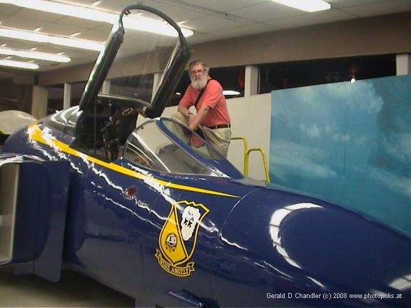 Inside there are three giant rooms that merge into each other. There are hundreds of airplanes, many more than on display in the National Air and Space Museum in Washington, DC. The latter may have the most famous planes, such as the Spirit of Saint Louis, but Pensacola has one or more of every type and from every era. One small part recreates life aboard a WWII aircraft carrier, including the pilots' briefing room. Another shows fighter planes from WWI to the most modern. One of the special things about the place was that you got to take a souvenir home. The one Gerry selected is shown below. With a little practice he will be joining the Blue Angels, the Navy precision flight team.