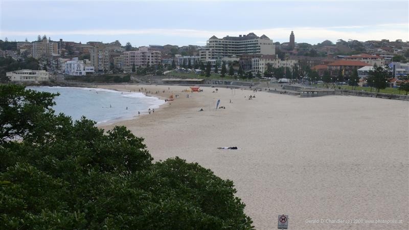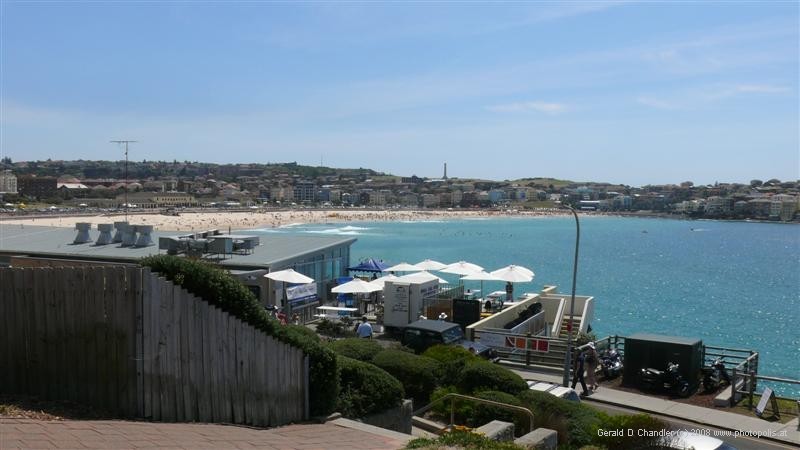 Bondi Beach is close enough to our place — five kilometers or three miles — that we could walk there. But for our first outing we took the train from Kings Cross, a station a five minute walk from us, to Bondi Junction. From there we walked (downhill, of course!) the last 1.5 kilometers. The photo above shows our first view of the beach as neared the south end of the beach. We had heard from a fan of another beach in the greater Sydney area that Bondi was not very good, but at first sight we guess any European would pay a lot to have such a beach on their front doorstep.