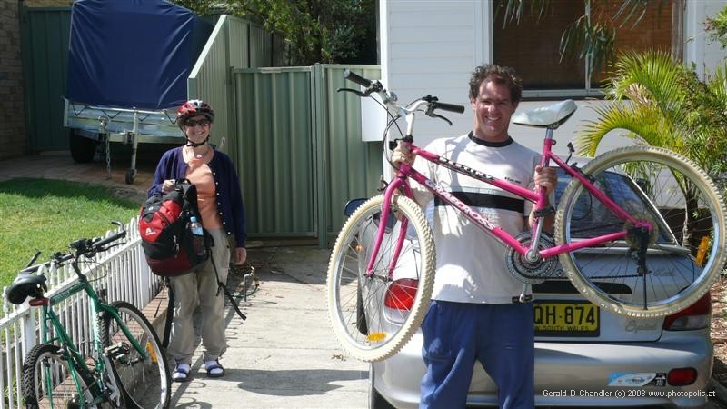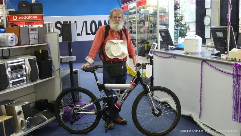 Back in 2002 we spent two months in Darlington and by bicycling almost everyday worked our way up from nulls to being able to do a 30 mile (50 km) round trip. We'd hoped to make a week trip from Darlington to Nottingham stopping every day at either farm bed-and-breakfasts or at friends along the way. But just when we were nearly in condition time ran out and off we went to London the usual way. Since then we have really hardly been on bicycles. The most recent two times were in Sumatra when we rented bikes for the day and again got a taste of it. Unfortunately the first time Gerry took quite a spill, requiring some first aid. Now we don't know whether the Sumatra experience should be described as wheting our appetites or as "inspite of". Either way, well before we got to Sydney Gerry set his heart on buying bicycles. His goal was to go around Sydney and later, if possible, tour part of the country. Jan liked the idea but Gerry was the piston in the engine. Once in Sydney we found it surprisingly hard to find used bicycles; that is, ones that had the price we wanted to pay. We saw one at a yard sale that was the kind of price we wanted but in such bad shape we immediately rejected it. We were advised to try e-Bay and checked it out once or twice but only to find a deal that was too good to be true: a $600 bike (almost new they claimed) for $60. We stayed well away from that one. Finally, after nearly four weeks in Sydney, when we were in Bondi Junction, a suburb of Sydney that has become our preferred shopping area, we found a man's bike in a pawn shop. Well, actually it was called "Cash Converters". These stores are akin to pawn shops, except, as far as we know, they buy things outright from customers who want money. We went in to ask about bicyles, expecting a response that they didn't have any, and were very happy to find they did. Being psychologically unprepared to buy, at first we didn't know what to do.