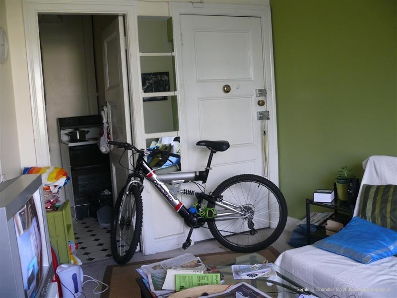 Before we got bikes we knew that we'd have a storage problem. There simply isn't any room for them. We'd asked our neighbor if she objected to a bike being in the hall and she didn't. We asked our landlord and she didn't. So now we keep the bike in the hall when we are active and put it in the living room before we go to bed.