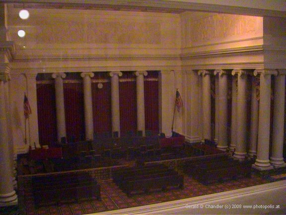 Even if you have a helicopter you aren't allowed to take pictures inside the Supreme Court chambers. So this picture, of a model in the mini-museum mentioned above, will have to do. On two separate days we came in and sat in three separate places. Our first seats, which we had for about twenty minutes, were what theatre owners call "partially obstructed". They were behind and to the left of the column on the left. We could see three out of nine justices - and by craning, the back of one lawyer. The same day, in a second seating, sat on the left rear, but with a clear view. We were very happy to be in court that time and equally sorry to leave. The next day we waited even longer but were rewarded with even better seats: Second row, center. We had direct views of all the justices and (the backs) of all of the lawyers. |