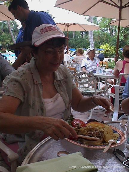After swimming we were treated to a nice meal on the terrace. It reminded Gerry of the old days in Nancy, France, when he would go swimming as often as possible at lunch time and then take his lunch by the side of the open air public pool. Even in the heat and humidity of Florida, there is something so pleasing about eating out of doors. Sadly, however, all good things must come to an end. After our great vacation from vacation we had to mosey on and leave Coco the terrier to take good care of our friends. In the words of the old Vera Lynn song from WWII: "We'll meet again, Don't know where, Don't know when, But we know we'll meet again some sunny day!" |